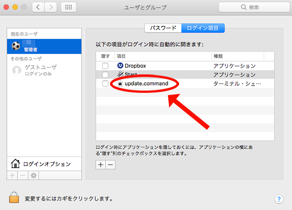 するとログイン項目に update.command が追加されました。